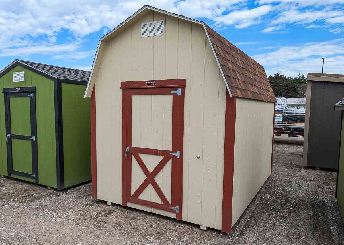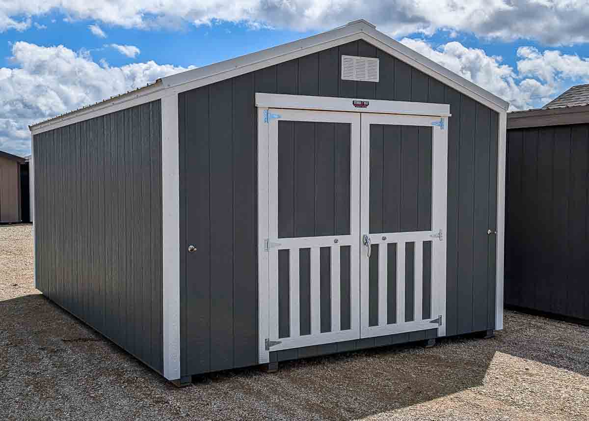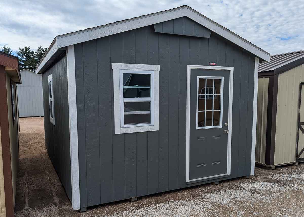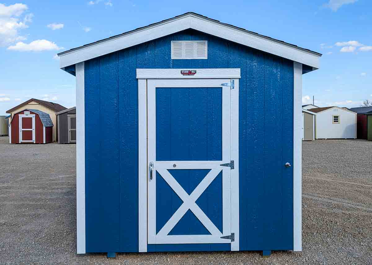 Siding: Blue;Trim: White;Roof: Sierra Gray; Price: $2975 + taxFree delivery within 65 miles of Hutchinson Rent-to-Own (36 months) approx. $131/mo. Quality features include: 7’ walls with studs 16" on center Laminated shingles 35.5"x6' door with magnetic catch Two wall vents To reserve this building please complete the following: [gravityform id="11" title="false" description="false" field_values="Name=#2C25798AN, 8x10...