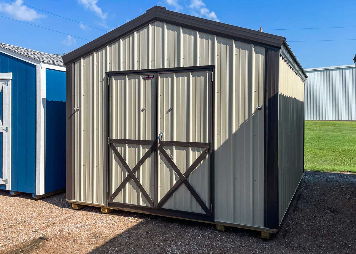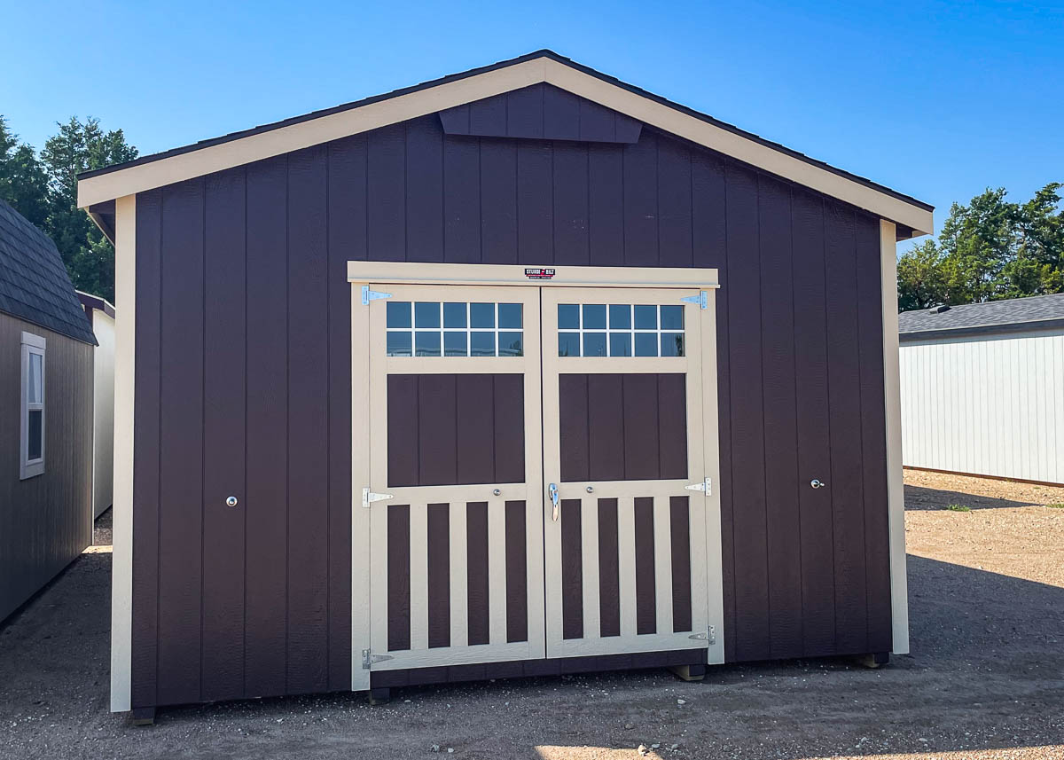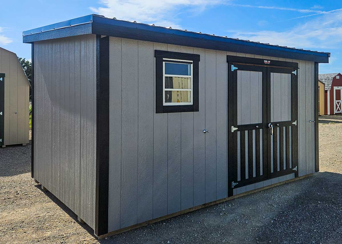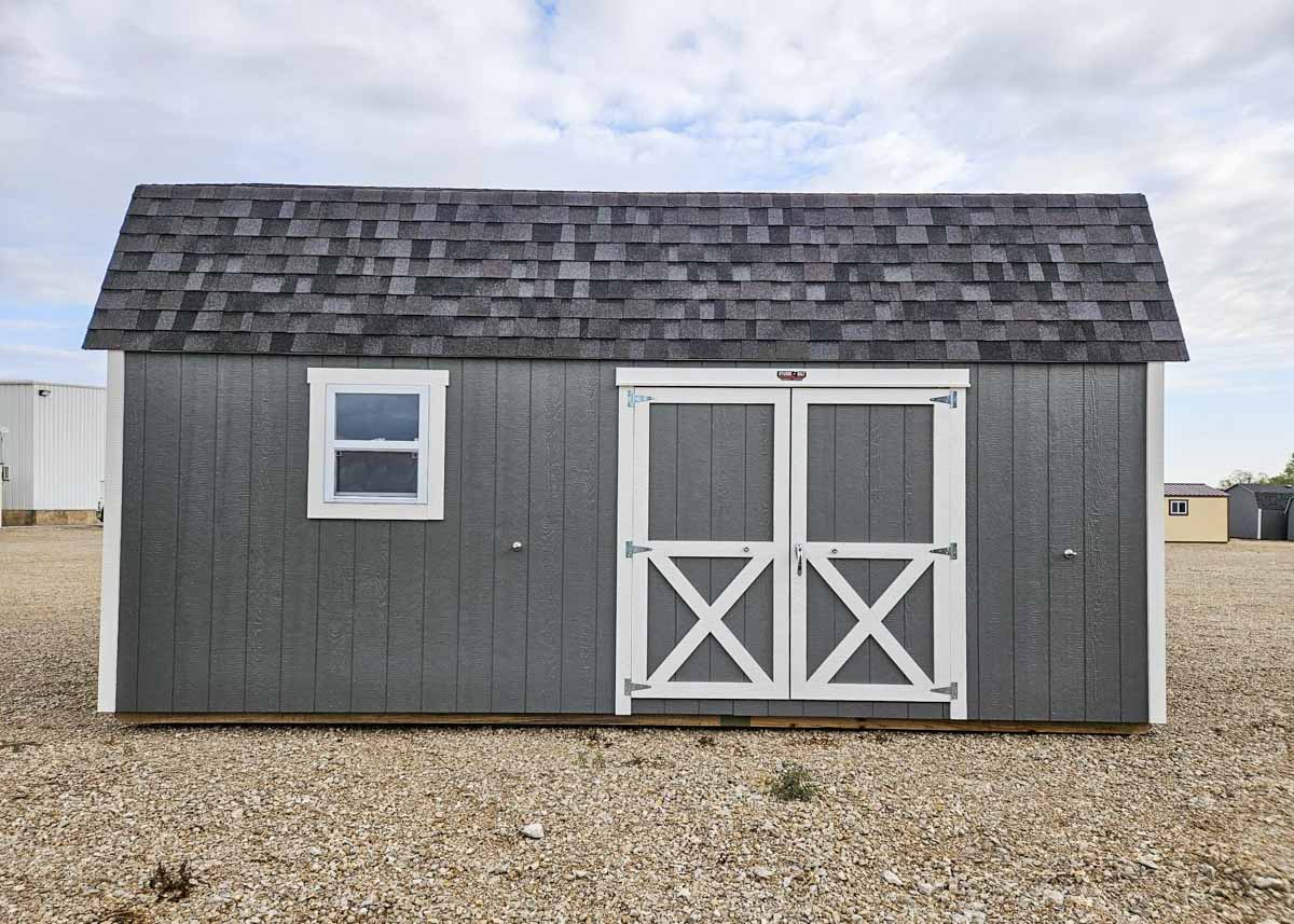 Siding: Charcoal;Trim: White;Roof: Williamsburg; Price: $10,124 less discount = $9624 + taxFree delivery within 65 miles of Hutchinson Rent-to-Own (36 months) approx. $424/mo. Quality features include: 7’ walls with studs on 16" centers Laminated shingles 6’x6' doors with magnetic catches Full loft and stairs One workbench One shelf Two 24"x28" windows One roof vent To reserve this...