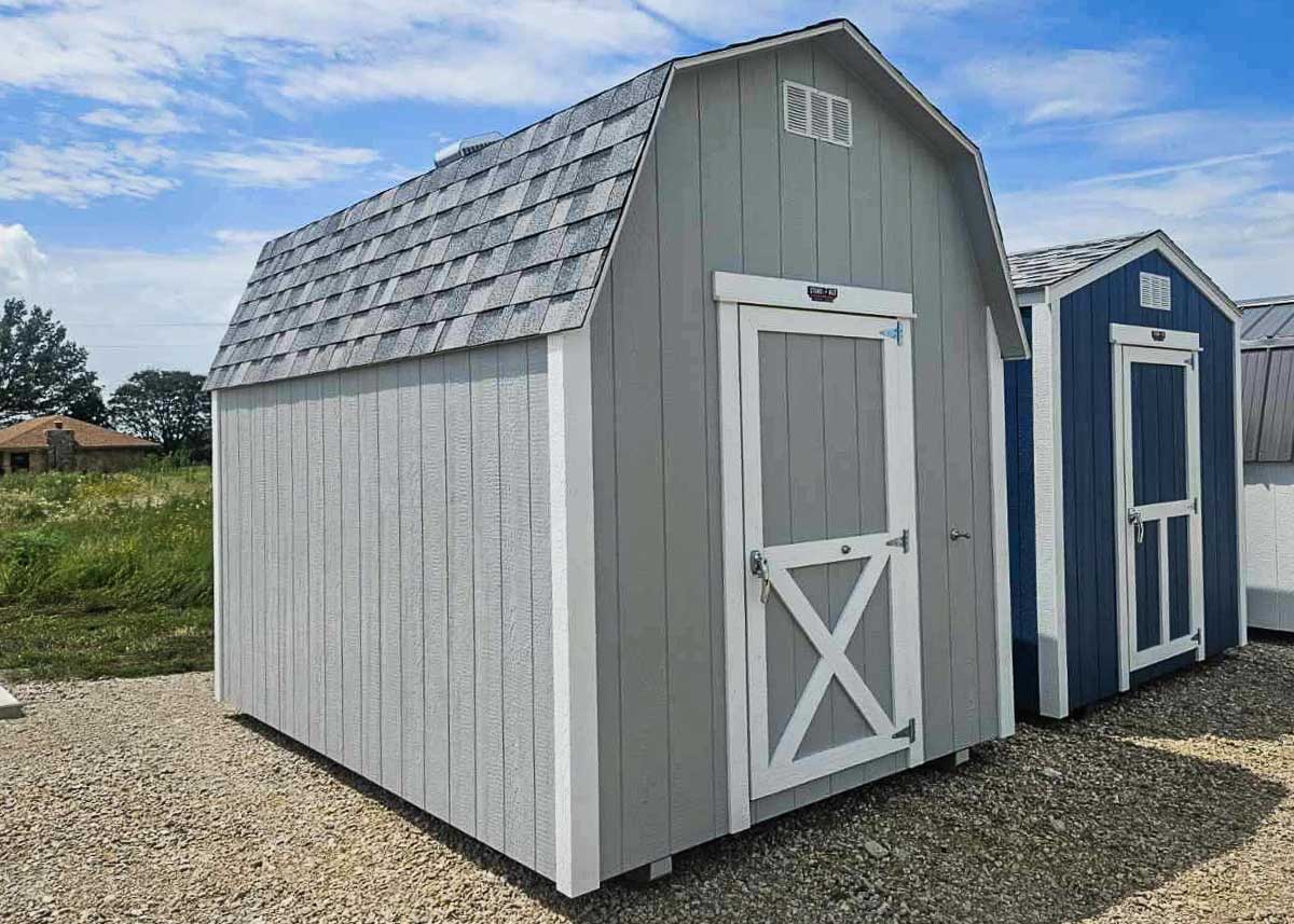 Siding: Gray;Trim: White;Roof: Sierra Gray; Price:  $4436 + taxFree delivery within 125 miles of Hutchinson (plus applicable out-of-state permit and pilot fees)Rent-to-Own (36 months) approx. $210/mo. Quality features include: 6’ sidewalls with studs 16" on center Laminated shingles 35.5"x6’ doors with magnetic catches One 3 pane awning window One workbench Two 4' lofts Two...