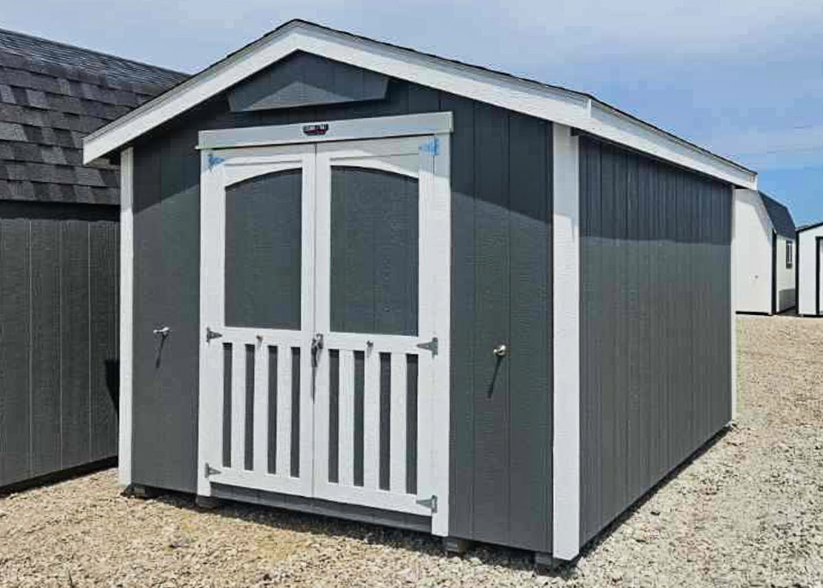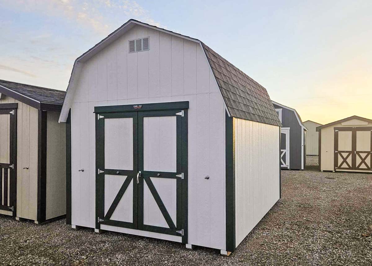 Siding: White;Trim: Green;Roof: Estate Gray; Price:  $5265 + tax Free delivery within 125 miles of Hutchinson (plus applicable out-of-state permit and pilot fees)Rent-to-Own (36 months) approx. $232/mo. Quality features include: 6’ walls with studs 16" on center Laminated shingles 5’x6’ doors with magnetic catches One workbench Two 4' lofts Two wall vents One roof vent  ...