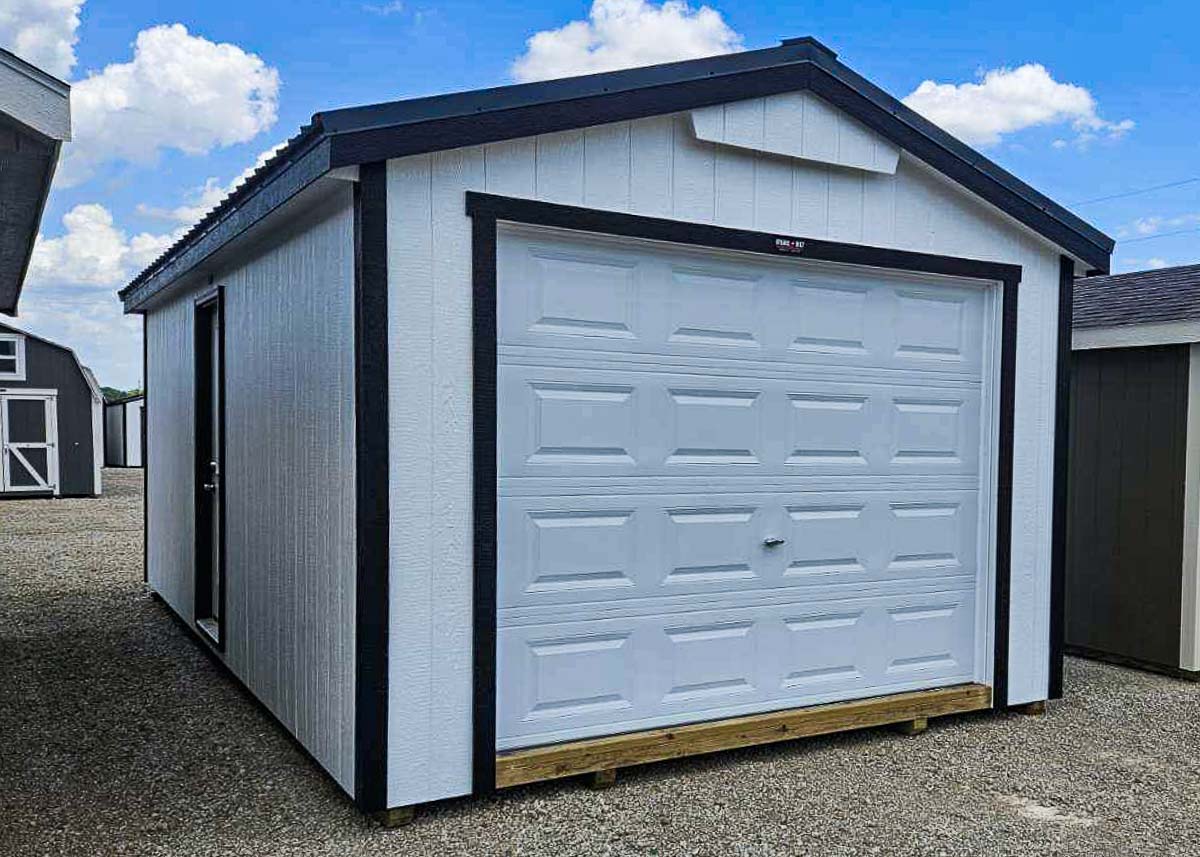 Siding: White;Trim: Black;Roof: Matte Black; Price:  $11,168 + taxFree delivery within 65 miles of HutchinsonRent-to-Own (36 months) approx. $492/mo. Quality features include: 8’ walls with studs 16" on center Steel roof Two car ramps One steel walk door with half glass 9x7 #2250 white garage door with O.C. lock One 24"x28" window One 24"x36"...