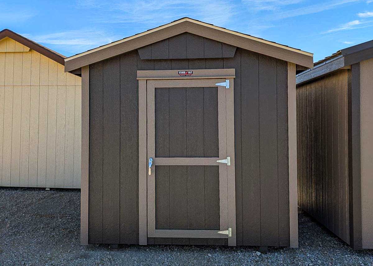Siding: Almond;Trim: White;Roof: Brilliant White; Price:  $10,076 + taxFree delivery within 65 miles of HutchinsonRent-to-Own (36 months) approx. $444/mo. Quality features include: 7’ walls with studs on 16" centers Steel roof 6’x6'5" doors with magnetic catches Full loft and stairs Two 24x28" windows One workbench To reserve this building please complete the following: [gravityform id="11" title="false"...