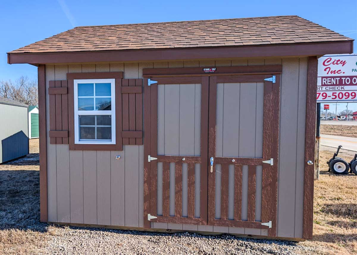 Siding: Sage; Trim: Almond; Roof: Brownwood; Price:  $4530 + tax Free delivery within 125 miles of Hutchinson (plus applicable out-of-state permit and pilot fees) Rent-to-Own (36 months) approx. $215/mo. Quality features include: 4’ walls with studs 16" on center Laminated shingles 5’x6’ doors One 3 pane awning window One workbench Two...