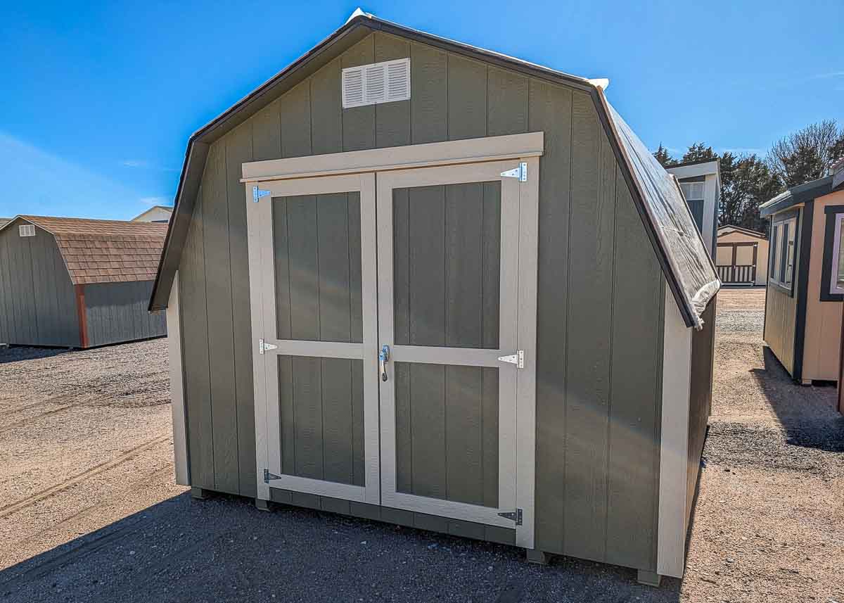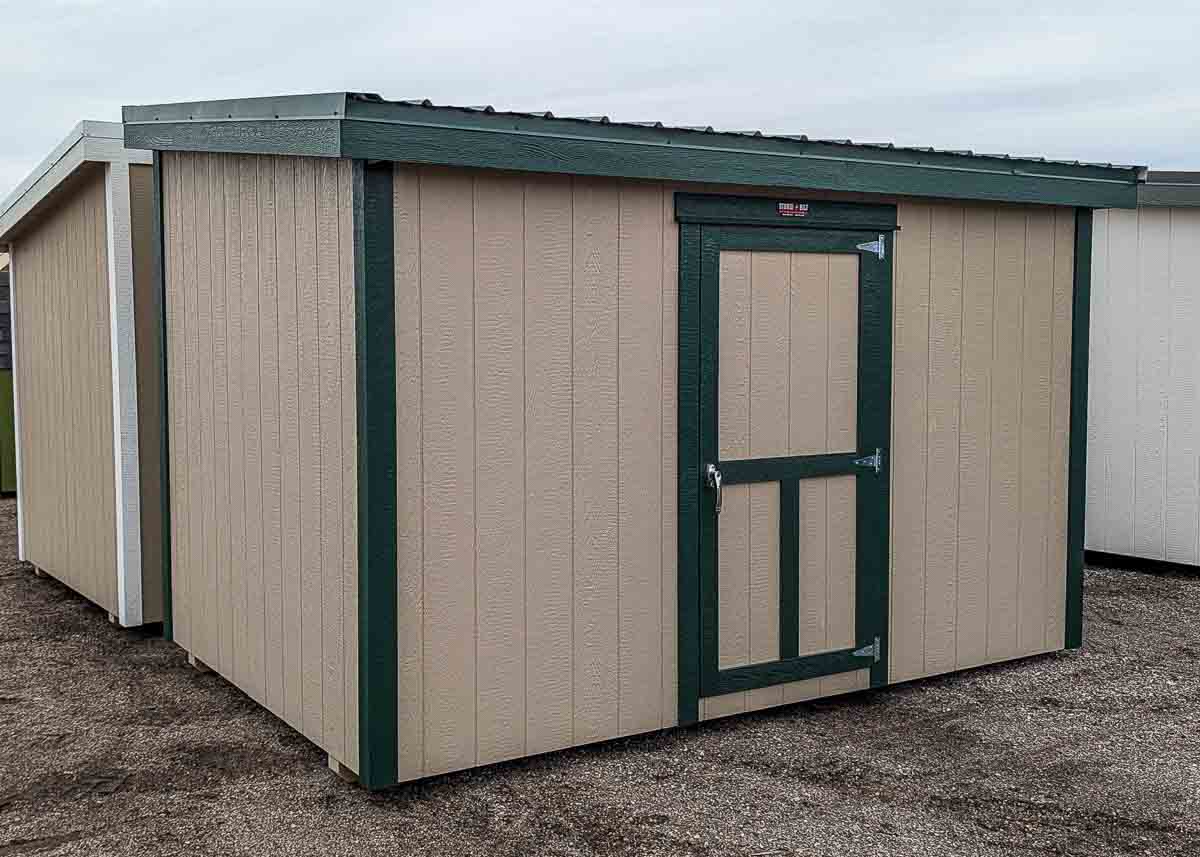 Siding: Taupe; Trim: Green; Roof: Hunter Green; Price:  $3570 + tax; Free delivery within 125 miles of Hutchinson (plus applicable out-of-state permit and pilot fees) Rent-to-Own (36 months) approx. $169/mo. Quality features include: 8' and 7’ walls with studs 16" on center Steel roof 35.5"x6’ door 6" overhangs on 3 sides   To...