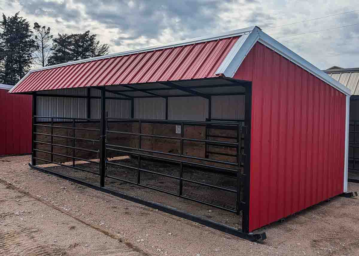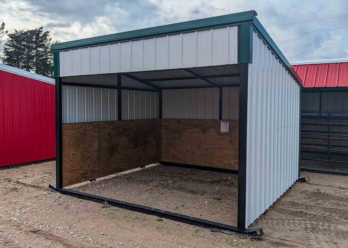 Siding: Brite Red; Trim: Brilliant White; Roof: Brite Red; Price:  $8370 + tax Free delivery within 65 miles of Hutchinson Rent-to-Own not available on steel frame shelters Quality features include: Steel frame 9’ frontwall, 7' backwall Front overhang 4' Treated plywood liner Crib guard Two 6-bar, 12' swinging gate 6-bar, 12'...
