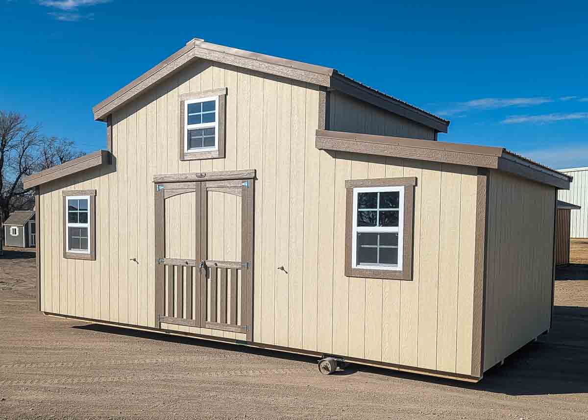 Siding:  Almond; Trim:  Buckskin; Roof: Buckskin; Price:  $13,465 + tax Free delivery within 125 miles of Hutchinson (plus applicable out-of-state permit and pilot fees) Rent-to-Own (36 months) $1,000 down plus security deposit required, then approx. $594/mo. Quality features include: 7’ walls with studs on 16" centers Steel roof 5'x6'5" doors with...