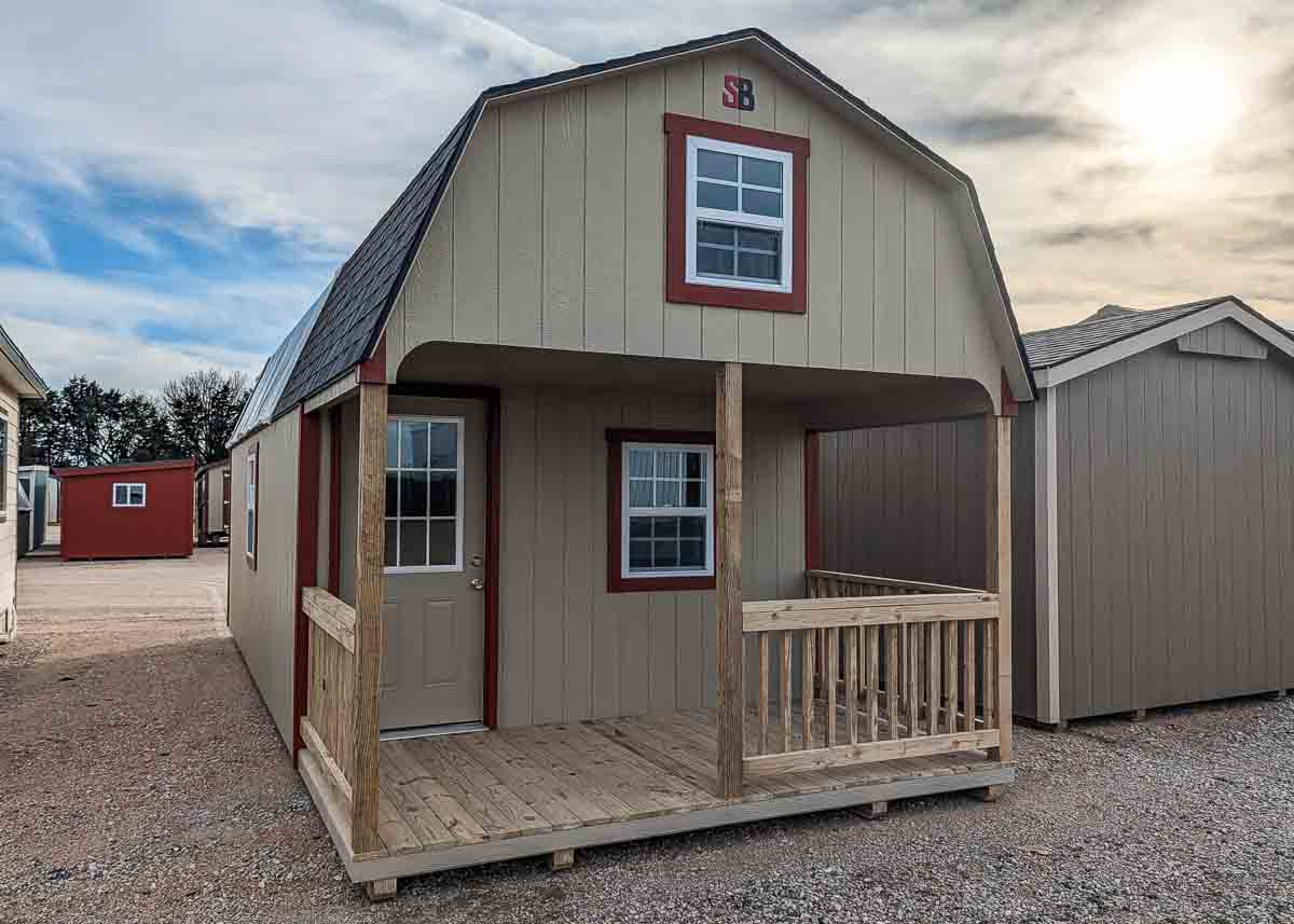 Siding:  Taupe; Trim:  Red; Roof:  Williamsburg; Price:  $13,730 + tax Free delivery within 125 miles of Hutchinson (plus applicable out-of-state permit and pilot fees) Rent-to-Own (36 months) approx. $650/mo. Quality features include: 7’ walls with studs on 16" centers Laminated shingles 6' Inset porch and railing Two lofts with railings and...