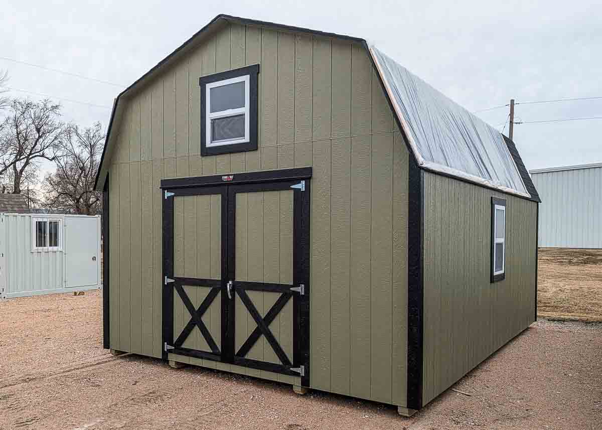 Siding: Sage;Trim: Black;Roof: Black; Price:  $10,986 + taxFree delivery within 125 miles of Hutchinson (Plus applicable out-of-state permit & pilots fees)Rent-to-Own (36 months) approx. $520/mo. Quality features include: 7’ walls with studs on 16" centers Laminated shingles 5’x6'5" double doors Full loft and stairs One workbench One 24"x28" window One 24"x36" window One roof...