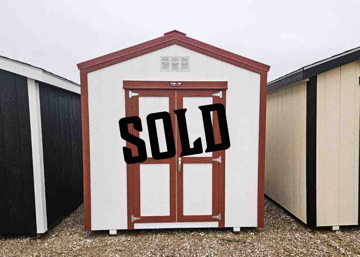 Siding: Almond; Trim: Burgundy; Roof: Driftwood; Price: $4699 less discount = $4464 + tax Free delivery within 65 miles of Hutchinson Rent-to-Own (36 months) approx. $197/mo. Quality features include: 7’ walls with studs 16" on center Laminated shingles 5'x6'5" doors with magnetic catches One 24x28" window One workbench One shelf Two...
