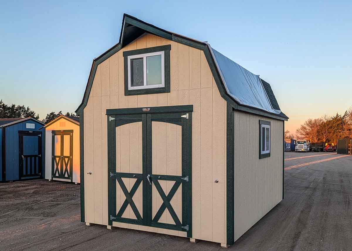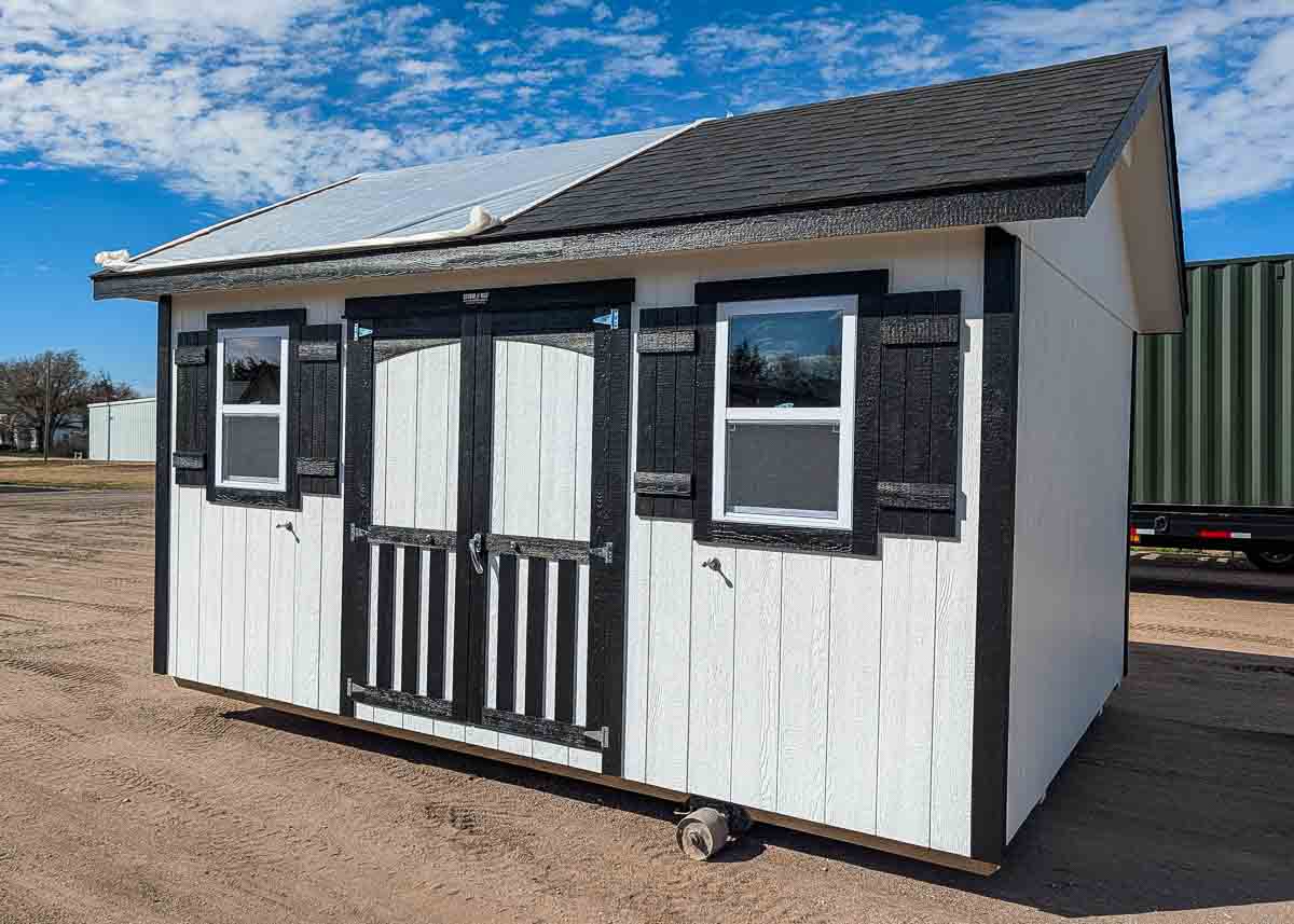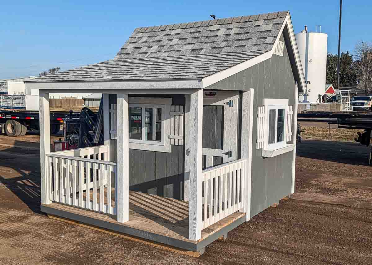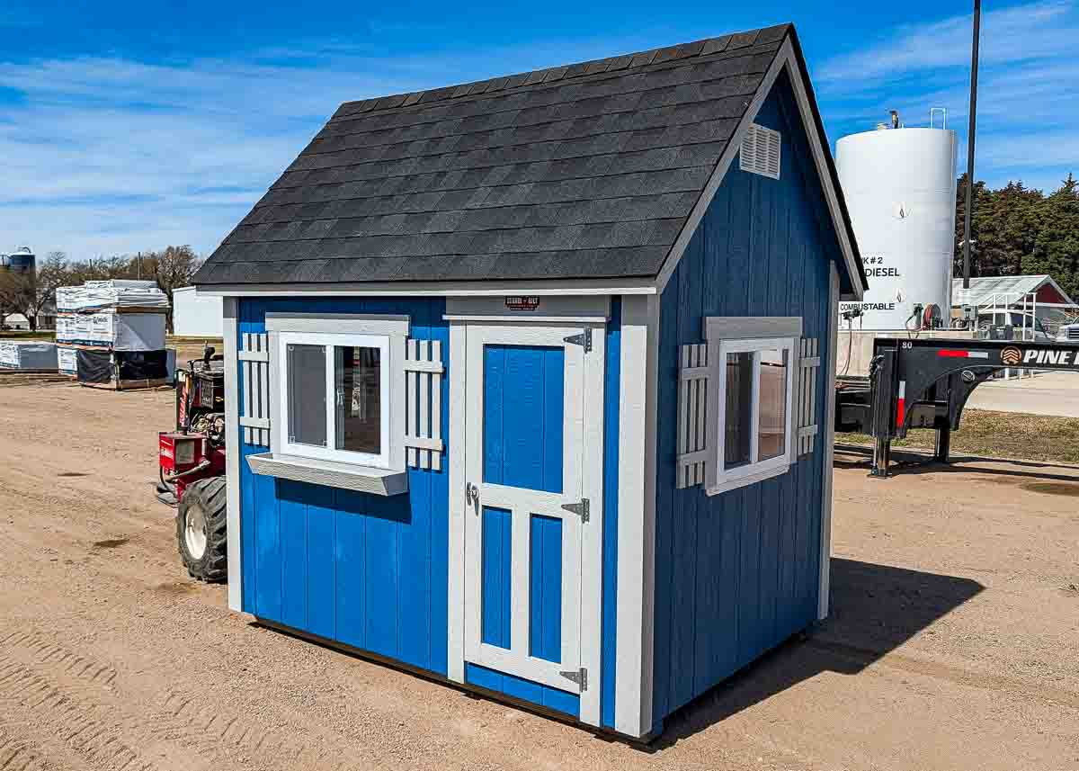 Siding: Blue; Trim: Grey; Roof: Black; Price: $3399 + tax Free delivery within 125 miles of Hutchinson (Plus applicable out-of-state permits & pilot fees) Rent-to-Own (36 months) approx. $150/mo. Quality features include: 5’6" walls Laminate shingles One 22"x 56" door Three 30x24" windows with shutters and flowerboxes One 4'x 6' loft...