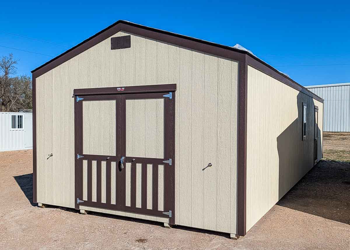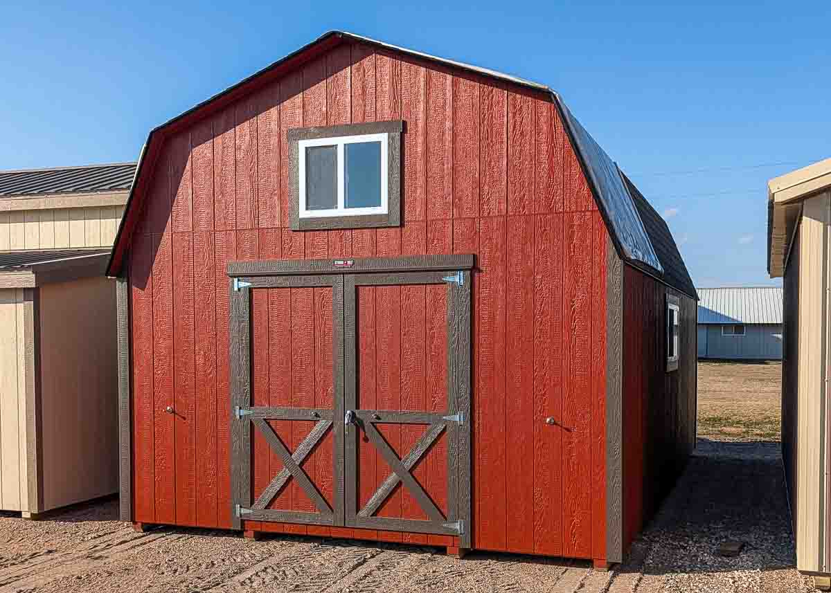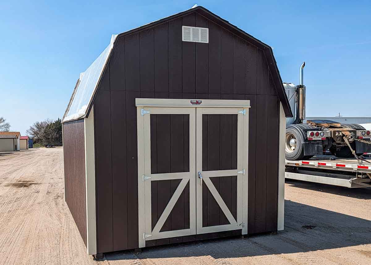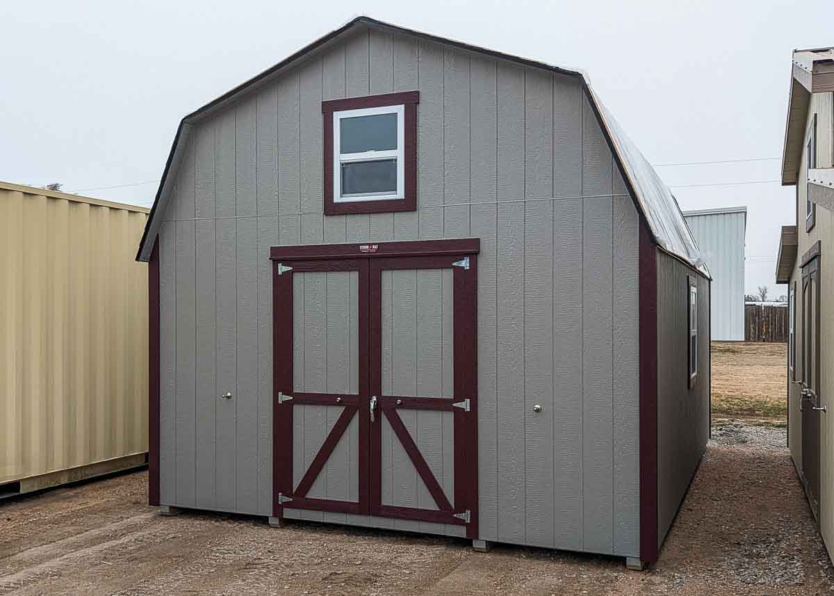 Siding: Blue; Trim: Grey; Roof: Black; Price: $3399 + tax Free delivery within 125 miles of Hutchinson (Plus applicable out-of-state permits & pilot fees) Rent-to-Own (36 months) approx. $150/mo. Quality features include: 5’6" walls Laminate shingles One 22"x 56" door Three 30x24" windows with shutters and flowerboxes One 4'x 6' loft...