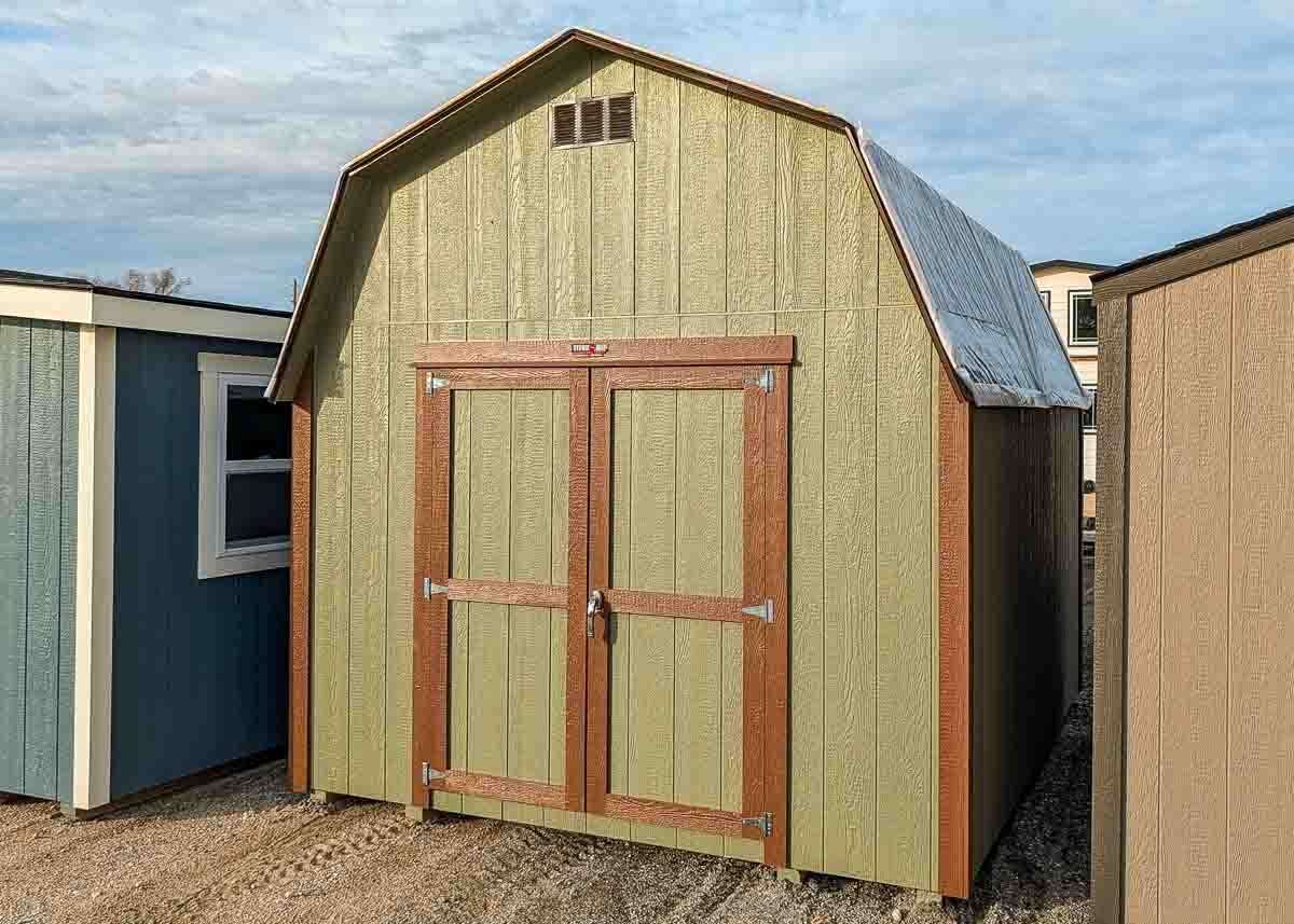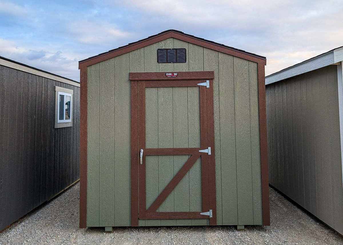 Siding: Sage; Trim: Brown; Roof: Brownwood; Price:  $4990 + tax Free delivery within 125 miles of Hutchinson (plus applicable out-of-state permit and pilot fees) Rent-to-Own (36 months) approx. $220/mo. Quality features include: 6’ walls with studs 16" on center Laminated shingles 5’x6’ doors Two 4' lofts One roof vent One wall...