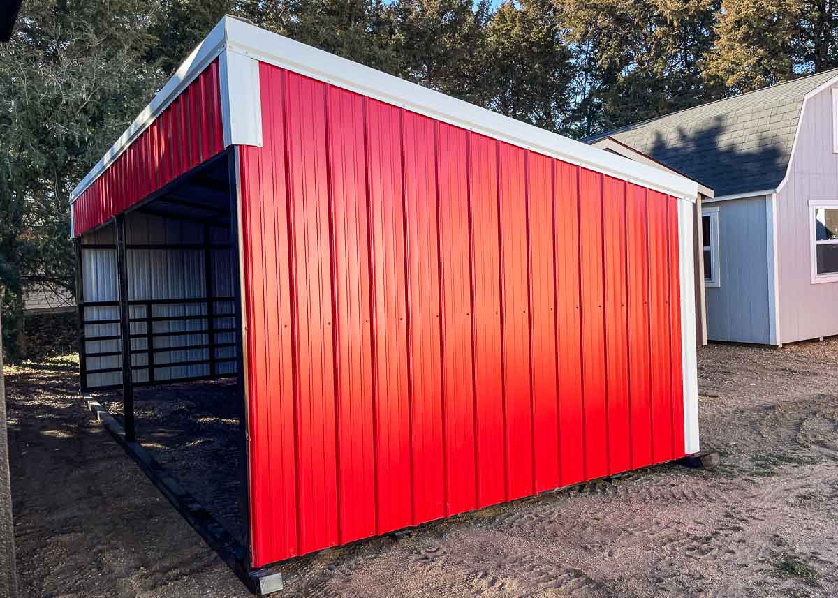 Siding: Brite Red; Trim: Brilliant White; Roof: Brite Red; Price:  $6965 + tax Free delivery within 65 miles of Hutchinson Rent-to-Own not available on steel frame shelters Quality features include: Steel frame 9’ frontwall, 7' backwall Drop down front Tin guard Ground anchors   To reserve this building please complete the following: [gravityform id="12"...