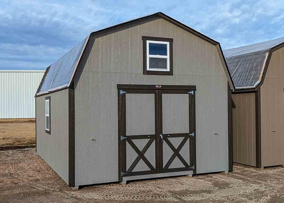 Siding: Pewter;Trim: Coffee;Roof: Williamsburg; Price:  $10,597 + taxFree delivery within 125 miles of Hutchinson (plus applicable out-of-state permit and pilot fees)Rent-to-Own (36 months) approx. $467/mo. Quality features include: 7’ walls with studs on 16" centers Laminated shingles 6’x6'5" doors with magnetic catches Full loft and stairs One workbench One shelf One 24"x28" window One 28x36" window One...