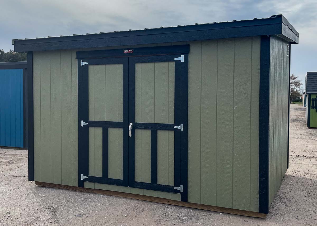 Siding: Sage; Trim: Black; Roof: Matte Black; Price:  $4440 + tax Free delivery within 125 miles of Hutchinson (Plus applicable out-of-state permit & pilot fees) Rent-to-Own (36 months) approx. $195/mo. Quality features include: 8' and 7’ walls with studs 16" on center Textured Steel roof 5'x6’ doors 6" overhangs on 3...