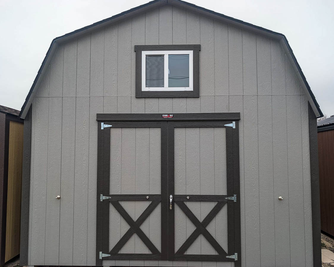 Siding:  Buckskin;Trim:  Slate;Roof:  Burnished Slate; Price:  $14,335 + taxFree delivery within 65 miles of Hutchinson Rent-to-Own (36 months) approx. $631/mo. Quality features include: 7’ walls with studs on 16" centers Steel roof with 5/8" plywood 4' Inset porch Two lofts with railings and stairs/ladder Steel walk door Two 24x28" windows with grills Two 28x36" windows...