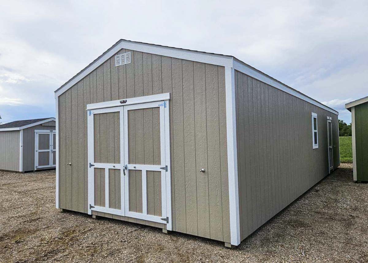 Siding: Taupe Trim: White; Roof: Driftwood; Price:  $15,273+ tax Free delivery within 65 miles of Hutchinson Rent-to-Own (36 months) approx. $673/mo. Quality features include: 8’ walls with studs on 16" centers Laminated shingles 6'x6'5" double doors with magnetic catches Extra door 35.5"x6' door with magnetic catch One 24"x36" window One 24"x28"...