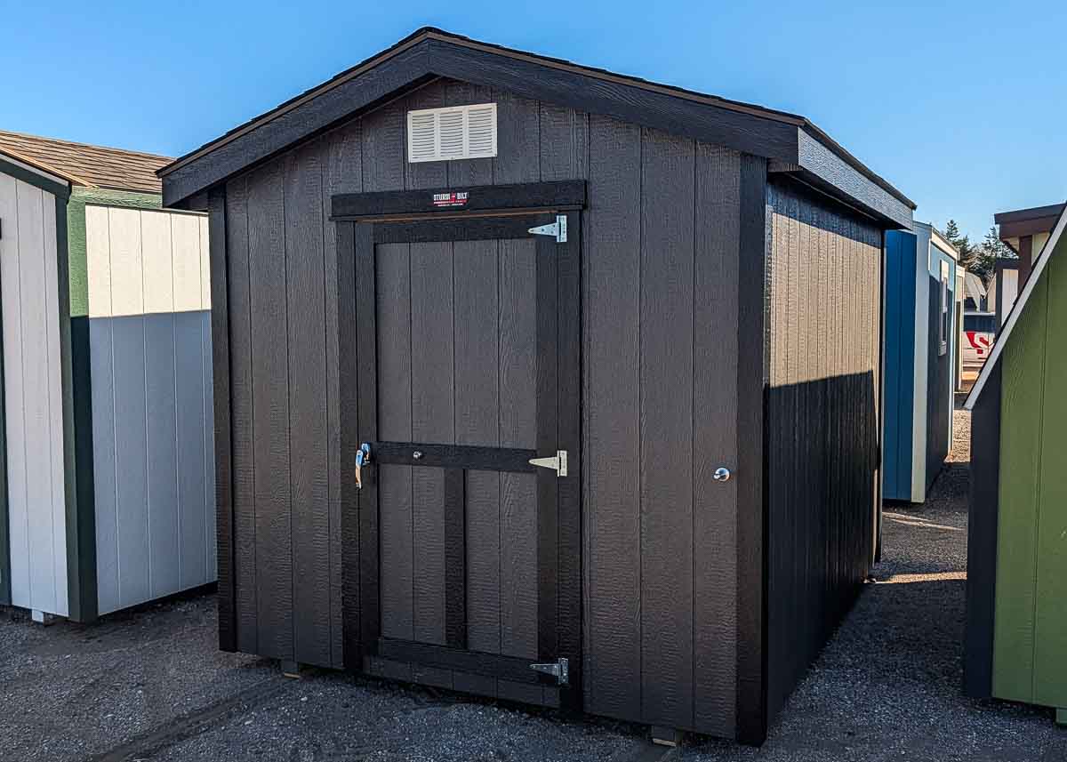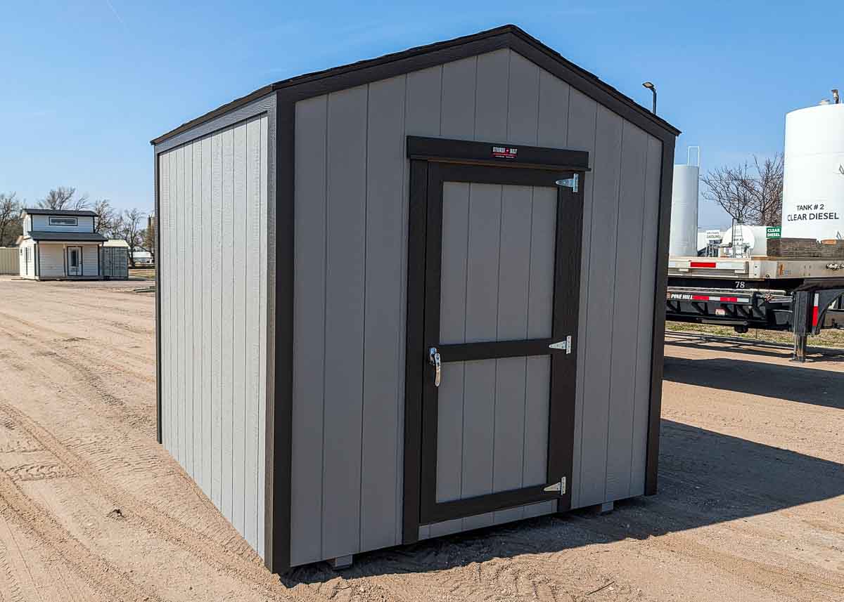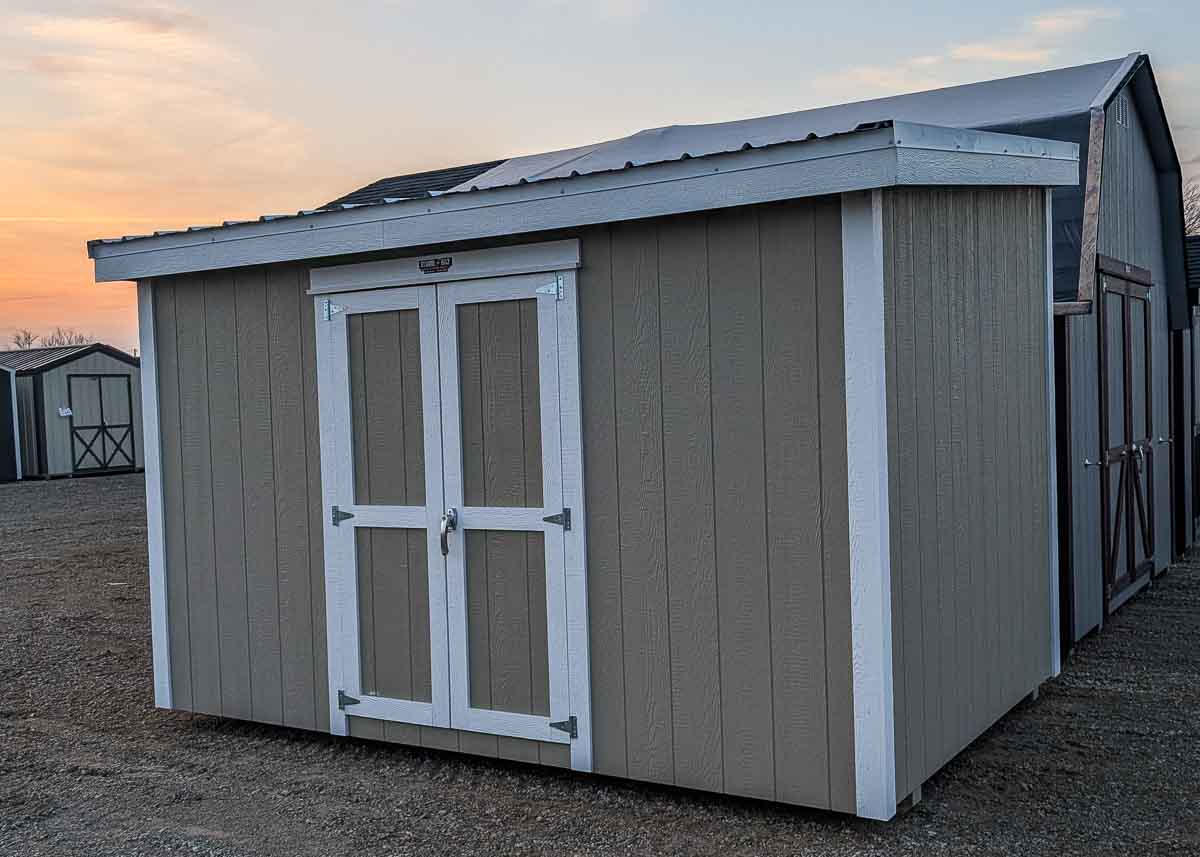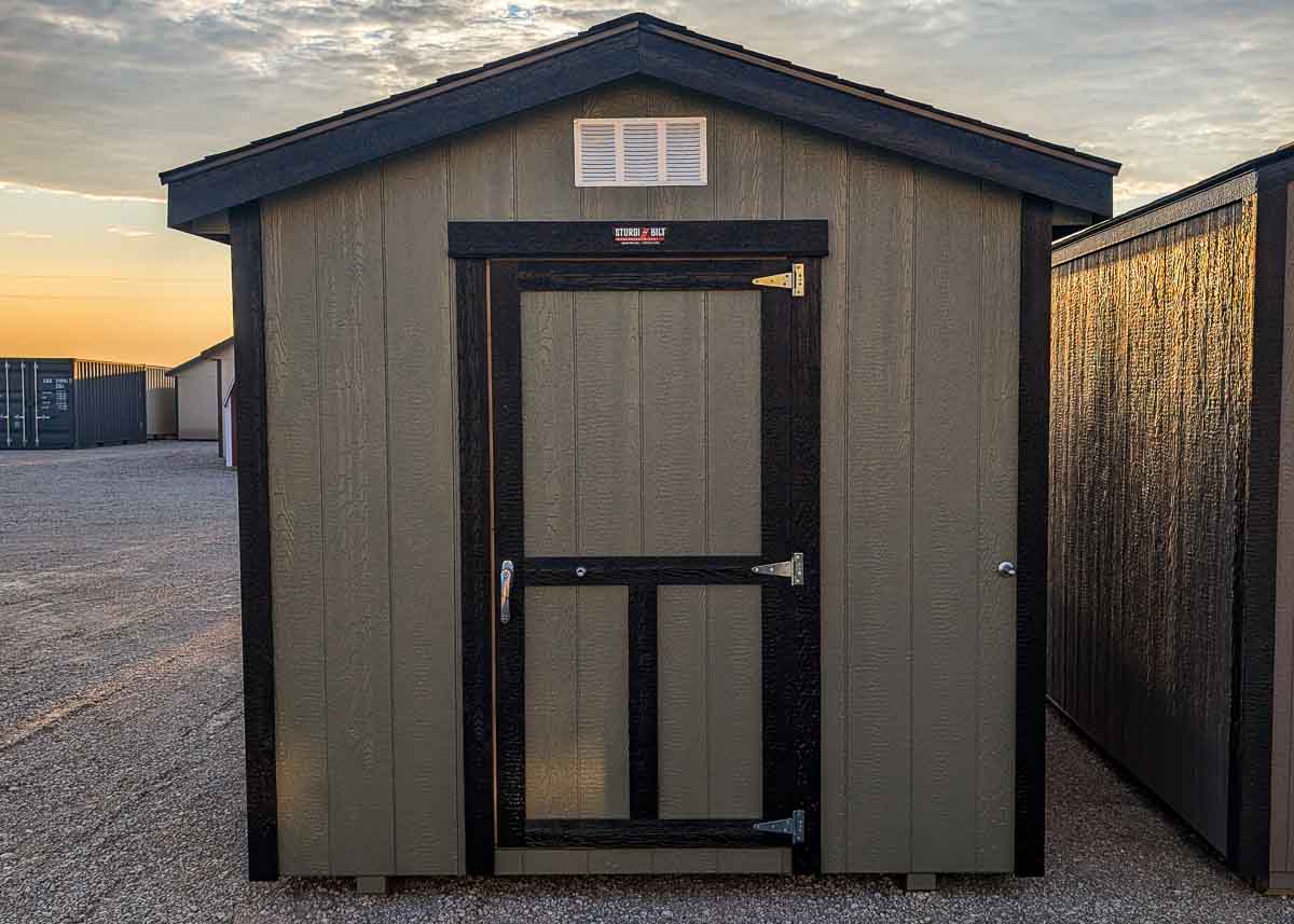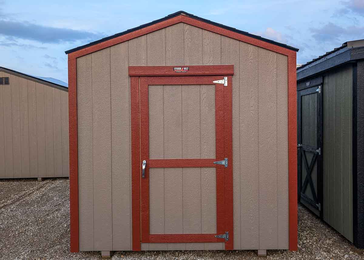 Siding: Almond;Trim: Red;Roof: Desert Rose; Price: $3960 + taxFree delivery within 65 miles of HutchinsonRent-to-Own (36 months) approx. $175/mo. Quality features include: 6’ sidewalls with studs 16" on center Laminated shingles 35.5"x6’ doors with magnetic catches One 3 pane awning window Two 4' lofts Two wall vents To reserve this building please complete the...